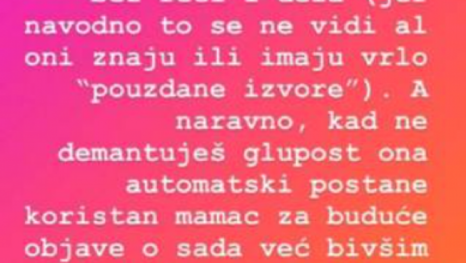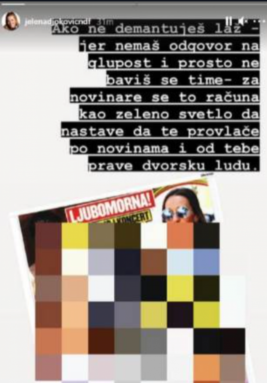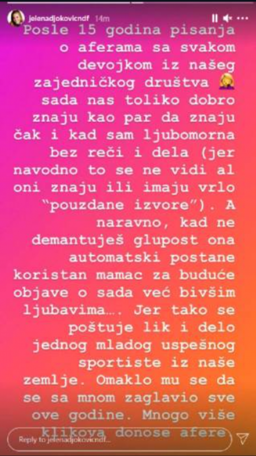 - Ako ne demantuješ laž jer nemaš odgovor na glupost i prosto ne baviš se time, za novinare se to računa kao zeleno svetlo da nastave da te provlače po novinama i od tebe prave dvorsku ludu. Posle 15 godina pisanja o aferama sa svakom devojkom iz našeg zajedničkog društva, sada nas toliko dobro znaju kao par da znaju da sam čak i ljubomorna bez reči i dela (jer navodno to se ne vidi, ali oni znaju ili imaju pouzdane izvore). A naravno, kad ne demantuješ glupost ona automatski postane mamac za buduće objave o sada već bivšim ljubavima... Jer tako se poštuje lik i delo jednog mladog uspešnog sportiste iz naše zemlje. Omaklo mu se da je sa mnom sve ove godine. Mnogo više klikova donose afere - napisala je Jelena na svom Instagram nalogu i dodala: