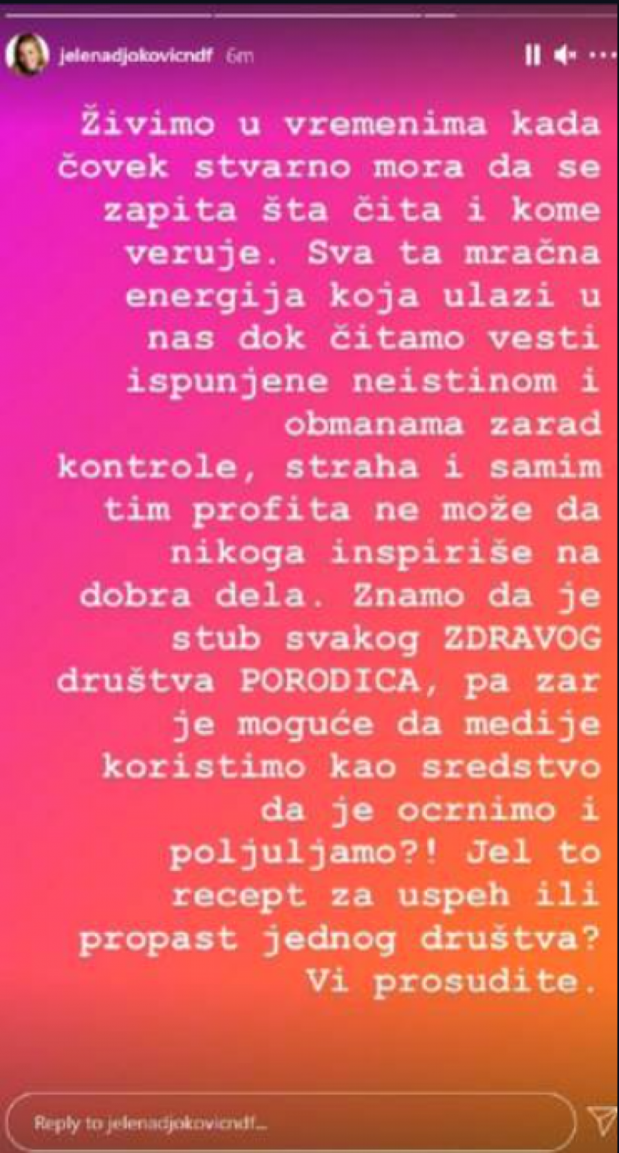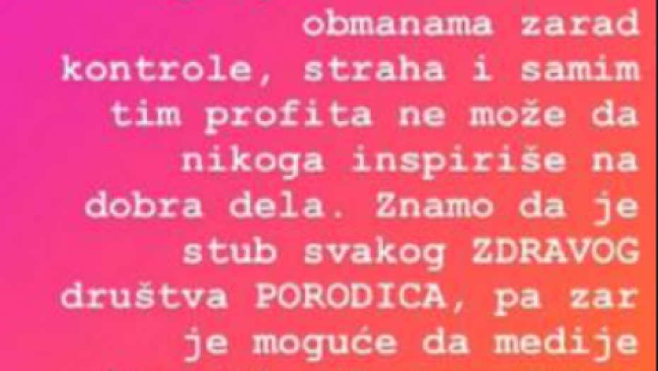 - Živimo u vremenima kada čovek stvarno mora da se zapita šta čita i kome veruje. Sva ta mračna energija koja ulazi u nas dok čitamo vesti ispunjene neistinom i obmanama zarad kontrole, straha i samim tim profita ne može da nikoga inspiriše na dobra dela. Znamo da je stub svakog zdravog društva porodica, pa zar je moguće da medije koristimo kao sredstvo da je ocrnimo i poljuljamo?! Jel to recept za uspeh ili propast jednog društva? Vi prosudite.