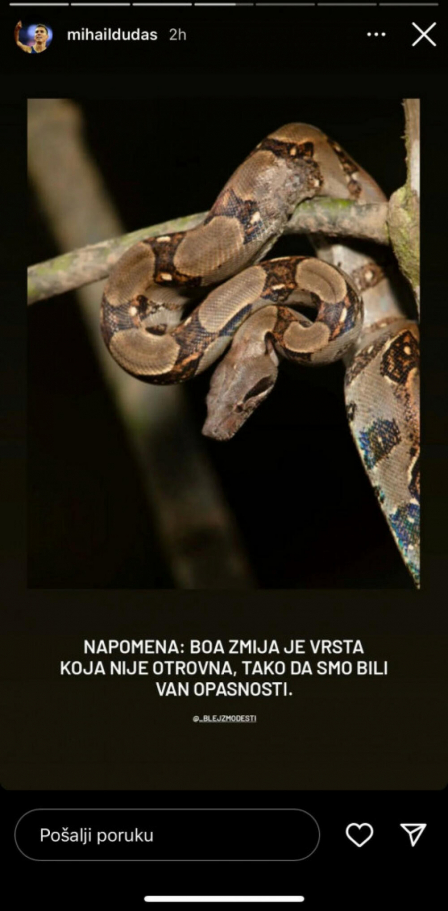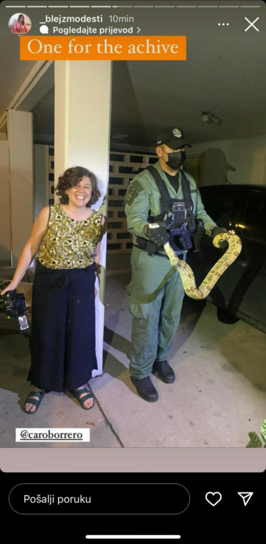 Naime, kako je Panama tropska zemlja, gde je pored sunca i velika vlažnost vazduha, mnogo je gmizavaca, pa je tako jedan zaršio ispred njihovih vrata, konkretnije zmija se našla na njihovom pragu.