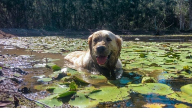 Slatki retriver je usred blatnjave bare - rovari po blatu i valja se sa neviđenim entuzijazmom.