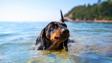 Štene se nesigurno drži na površini, a rotvajler pokazuje kako se pliva. Svojim šapama energično udara po vodi, kao da joj poručuje: "Samo radi nogama ovako!".