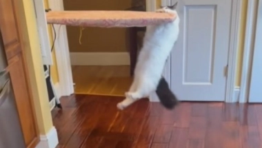 Video prikazuje mačka koji sa lakoćom izvodi zgibove na dasci za peglanje, savršeno kontrolišući svaki pokret kao da je na gimnastičkoj spravi.