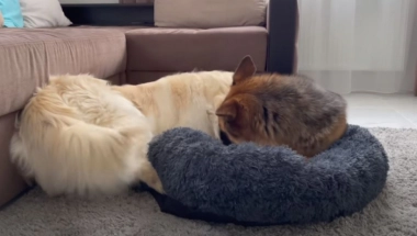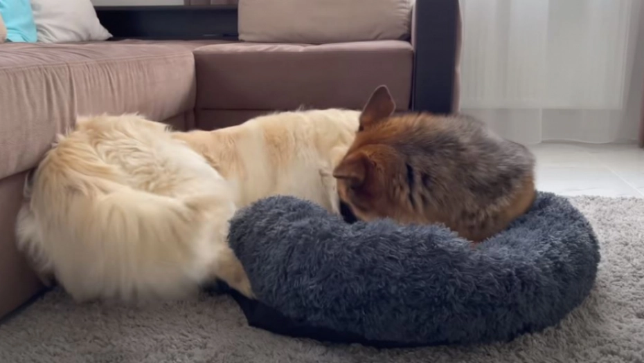 Vlasnici zlatnog retrivera Bailija i nemačkog ovčara Rokija snimili su njihovu svađu zbog kreveta.