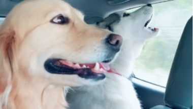KADA PSI NAPRAVE ATMOSFERU Tokom vožnje dva haskija zapevala, a reakcija retrivera će vas ozbiljno nasmejati