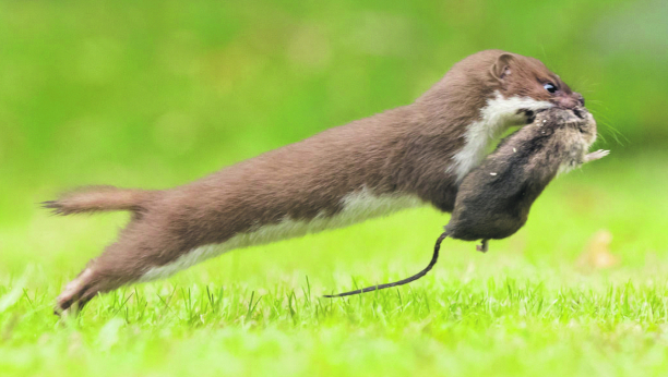 Škotski fotograf Norman Votson uhvatio je tipičnu metaforu života u divljini. Na prvoj slici lasica skrivena u cevi radoznalo posmatra u foto-objektiv, dok par trenutka kasnije trči brzinom vetra preko polja s izbezumljenim mišom u ustima. Na poslednjoj gleda gde će da se smesti i pojede svoj plen.