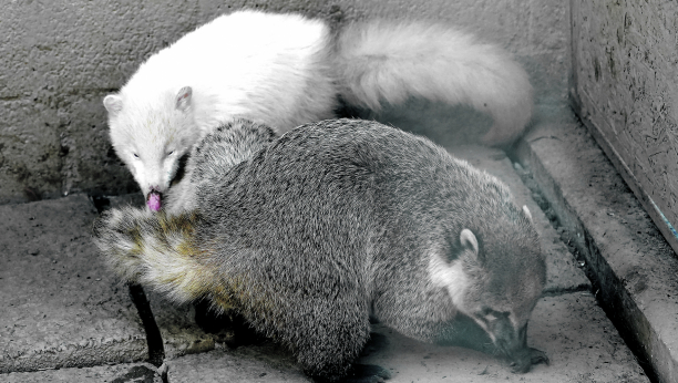 Koati, iz roda rakuna, žive u Južnoj i Centralnoj Americi, a nije im loše ni u Zoološkom vrtu "Al Maljo", nedaleko od Lugana, u Švajcarskoj.Pretprošle godine je na svet došlo šestoro mladunaca, od kojih su tri bela, odnosno albino, što je, kako kažu u ovom vrtu, vrlo retko.