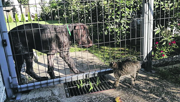 Srećom, žičana ograda sprečava da oštrodlaki nemački ptičar Roki i novi mezimac porodice Stepković, takođe mladunac, mačak Marinko, dođu u otvoreni sukob.