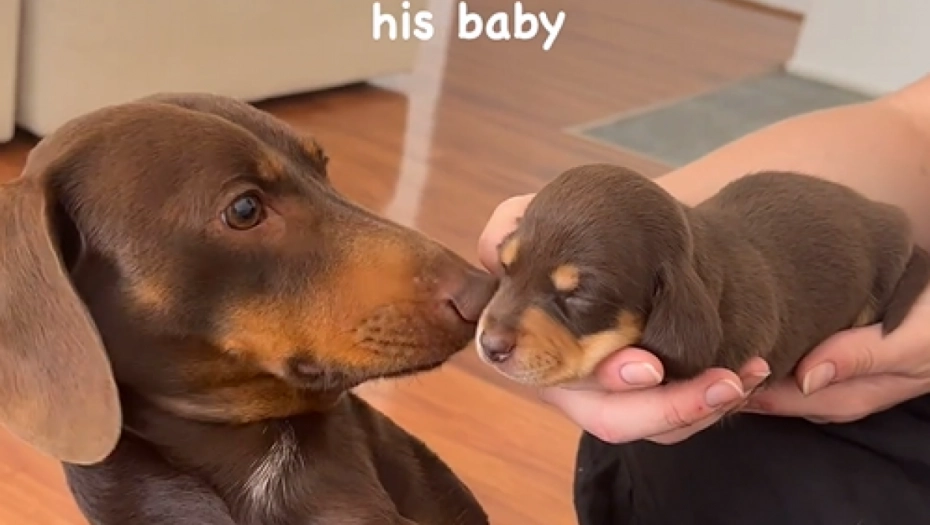 U viralnom klipu, koji je na Instagramu podeljen pod korisničkim imenom @little.feet.dachshunds, sva pažnja je na psu koji maše repom i njuši minijaturno štene, svoju sliku i priliku. Pas se tada sa zbunjenim i „šokiranim“ izrazom lica okreće vlasniku, kao da se pita da li je on zaista otac mališana.