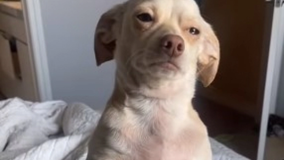 Na snimku se vidi mali, beli pas kako sedi na krevetu na zadnjim šapama i gleda u svoju vlasnicu sa očima punim suza.