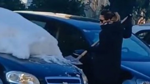 Na snimku se vidi žena kako lopatom čisti sneg sa šoferšajbne svog parkiranog automobila.