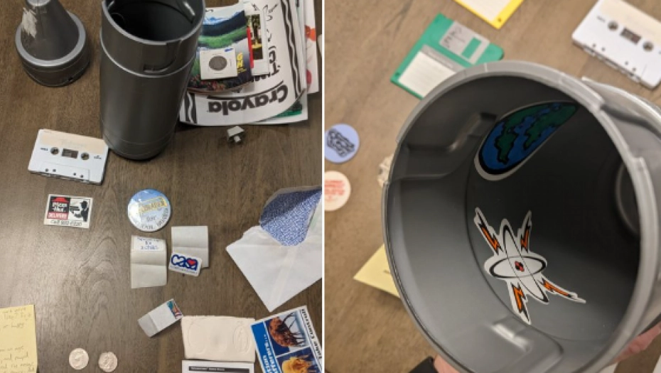 Unutra je pronašao stari pamflet o HIV-u, drogama i alkoholu, porodične fotografije, nalepnice, reklamu za slatkiše, novčić iz 1877. godine i diskete za računar.