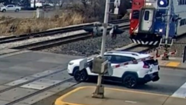 Video prikazuje trenutak kada je voz, koji je bio u punoj brzini, jurišao prema pružnom prelazu, dok je beli džip delimično blokirao šine.