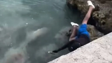 Nesrećni muškarac stajao je na stenama blizu vode kada se okliznuo, a u trenutku kada je „sleteo“ na rep morskog predatora, ajkula je instinktivno reagovala otvaranjem čeljusti.