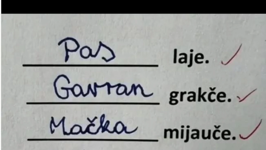 Na naizgled jednostavan zadatak u kojem se traži da upiše koje životinje se oglašavaju zadatim zvukovima, umesto da napiše da je krava ta koja muče, učenik je samouvereno napisao da njega muče – leđa.