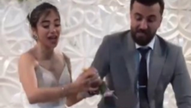 Ali, u trenutku kada se mlada naginje nad tortom i vadi nož, mladoženja grabi priliku – i rukom joj gura glavu pravo u tortu.
