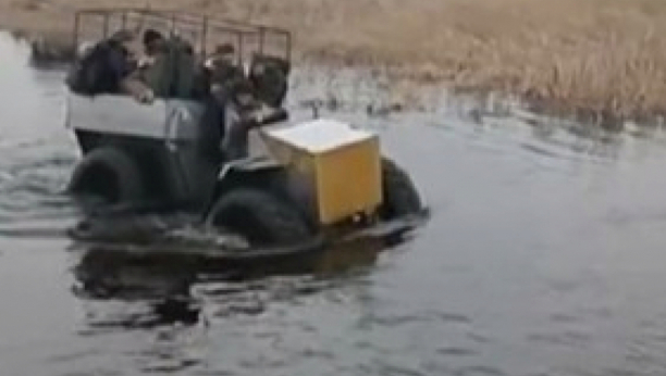 U centru pažnje je neobično vozilo koje podseća na traktor, ali ima sposobnost da se kreće po vodi – prava mala improvizovana amfibija. Vozač, očigledno zadovoljan performansama, sve vreme gleda u kameru dok u prikolici prevozi grupu putnika.