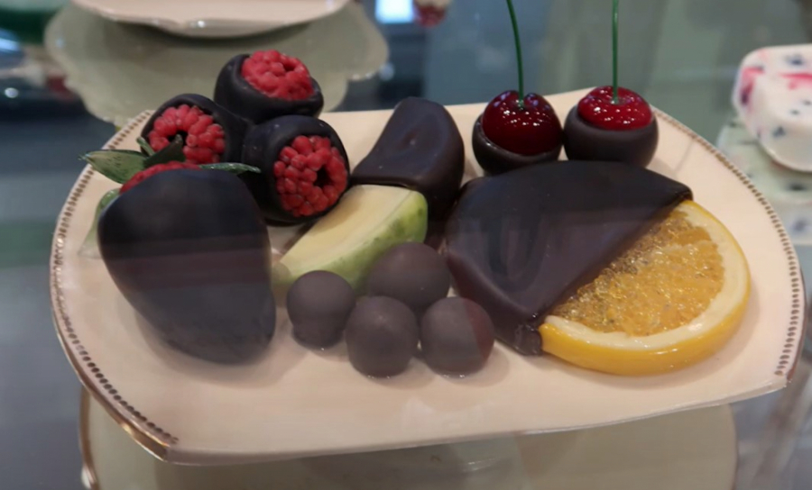 I ima dosta radova koji izgledaju dovoljno dobro za jelo, kao što su skulpture od stakla i porcelana Šejne Leib inspirisane američkim i francuskim dezertima.