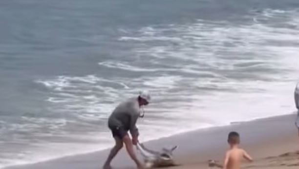 Kamera je zabeležila napeti trenutak – dok je držao ajkulu za rep, okupljeni posetioci plaže, među kojima su bila i deca, pratili su situaciju sa nevericom. U jednom trenutku, ajkula se trzala i zagrizla ribara, a zatim nestala u dubinama.