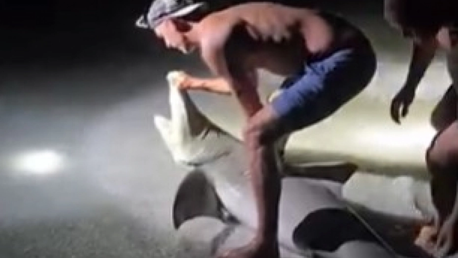Prema snimku koji se širi društvenim mrežama, grupa Amerikanaca izvukla je ogromnu ajkulu na obalu, a Mijus je odlučio da se namesti za fotografisanje pored opasnog predatora.
