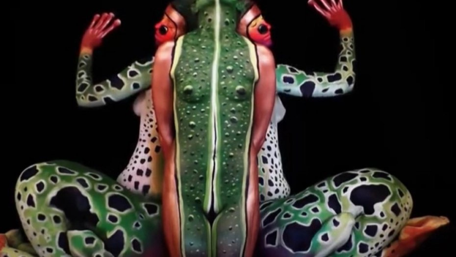 Na prvi pogled izgleda kao crvenooka žaba. Međutim, pažljivije posmatranje otkriva da su zapravo u pitanju ljudski modeli oslikani tako da tvore životinju.