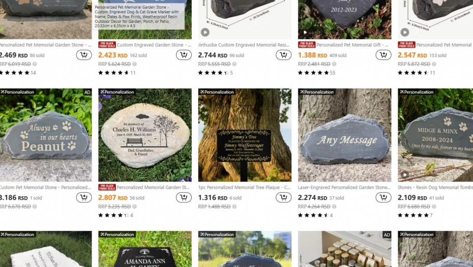 Među ponuđenim proizvodima su ploče sa fotografijama i natpisima, spomenici za kućne ljubimce, kao i dekorativni predmeti poput plastičnih spomenika sa cvetovima i natpisima. Cene ovih proizvoda variraju, ali se često kreću oko 3000 dinara, što je značajno niže od tradicionalnih nadgrobnih spomenika.