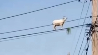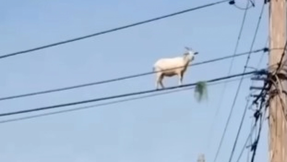 Na snimku se jasno vidi koza koja bez imalo nesigurnosti balansira na dalekovodu, dok ispod nje nesmetano prolaze pešaci i automobili, potpuno nesvesni spektakla iznad svojih glava.