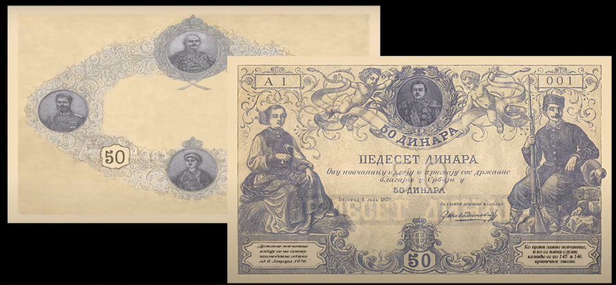 Crteži su: u sredini gornjeg dela je crtež poprsja kralja Milana Obrenovića (knjaz srpski 1868-1882., kralj Srbije 1882-1889); u sredini donjeg dela je grb Kraljevine Srbije; sa leve strane je crtež žene u narodnoj nošnji, sa snopom žita i srpom; sa desne strane je crtež srpskog vojnika onog vremena sa puškom.
