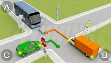Redosled prolaska je B,C,A. Prvi kamion, jer je na putu sa prvenstvom. Zeleni automobil ide pre autobusa. Obrnuti trougao i znak stop su znakovi iste vaznosti, pa se primenjuje pravilo desne strane, tj. opste pravila saobracaja!