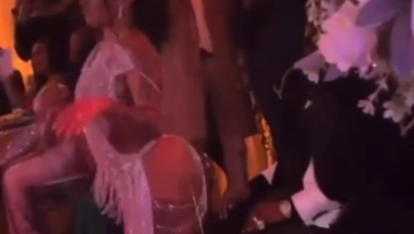 Mlada je u šljokičastoj venčanici s izrezom na području zadnjice, s halterom, bosa i u tangama, otplesala svom novopečenom suprugu u krilu uz stihove Bijonsinogo hita "Dance for You/Ples za tebe".