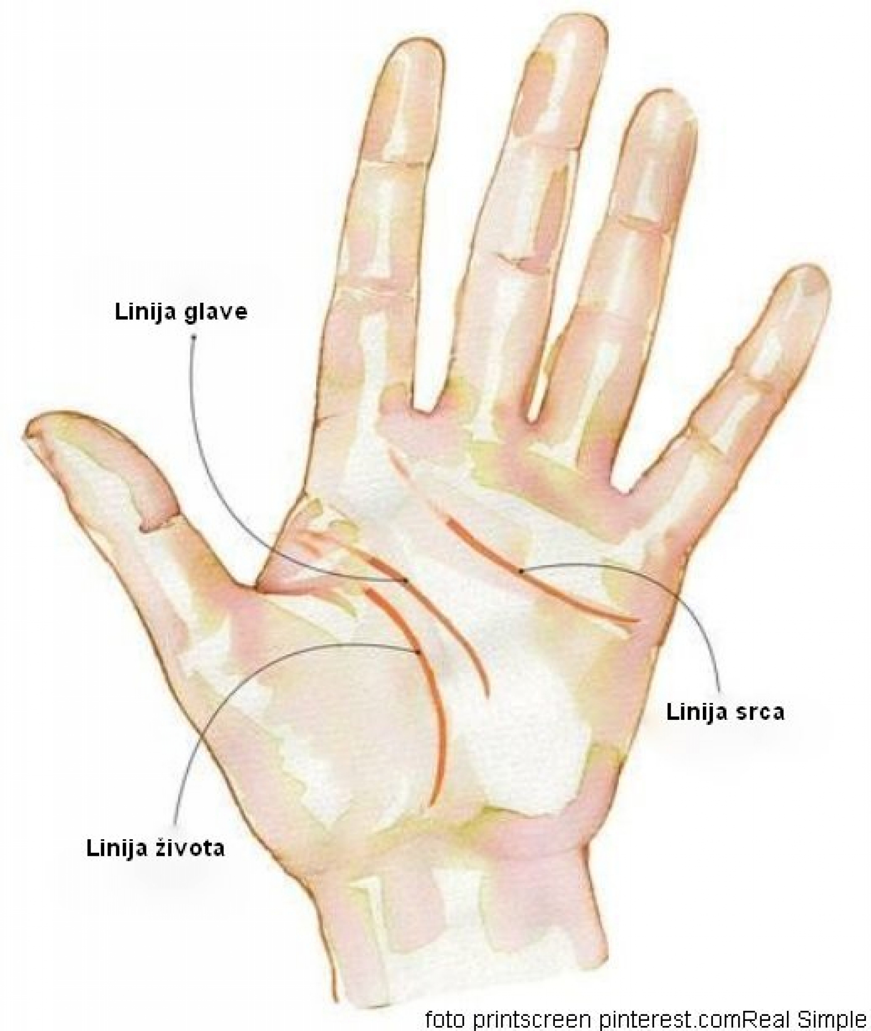 Jedna od tri glavne linije je ova linija koja se zove “linija života”, a kako joj ime kaže, prilično je važna. U principu, to ukazuje na vaše zdravlje i put kojim će vaš život ići, ali suprotno popularnom verovanju, ne diktira kada ćete umreti. Bez obzira da li je kratka ili duga, definiše vaš pristup zdravlju.