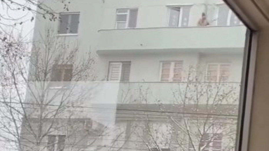 Ništa tu ne bi bilo čudno da ovaj čovek nije sa svoje terase bacao lopate snega na prolaznike Bulevara, a u jednom trenutku kako se vidi na snimku pogodio je jednog šetača.