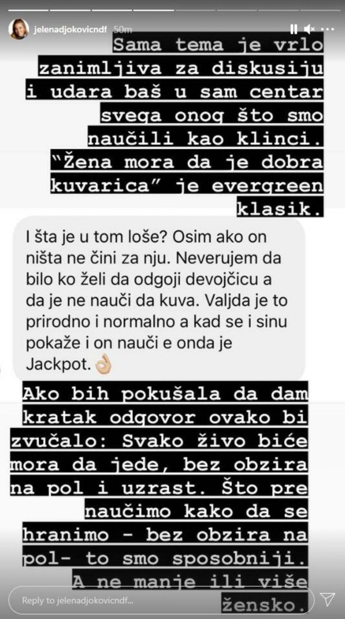 "Sama tema je vrlo zanimljiva za diskusiju i udara baš u sam centar svega ono što smo naučili kao klinci... "Žena mora da je dobra kuvarica" je evegreen klasik. Ako bih pokušala da dam kratak odgovor, ovako bi zvučalo "svako živo biće mora da jede, bez obzira na pol i uzrast. što pre naučimo kako da se hranimo — bez obzira na pol — to smo sposobniji... A ne manje ili više žensko", zaključila je Jelena.