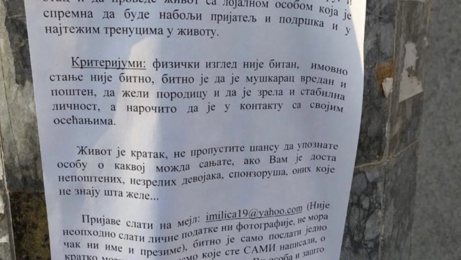 Poštena, skromna devojka, zdrava, obrazovana i ostvarena, od 25 godina, prijatnog izgleda, traži momka sličnih godina koji želi da se ostvari kao suprug i otac i da provede život sa lojalnom osobom koja je spremna da bude najbolji prijatelj i podrška i u najtežim trenucima u životu, glasi početak oglasa zalepljenog na banderu kojim jedna Milica traži muža.