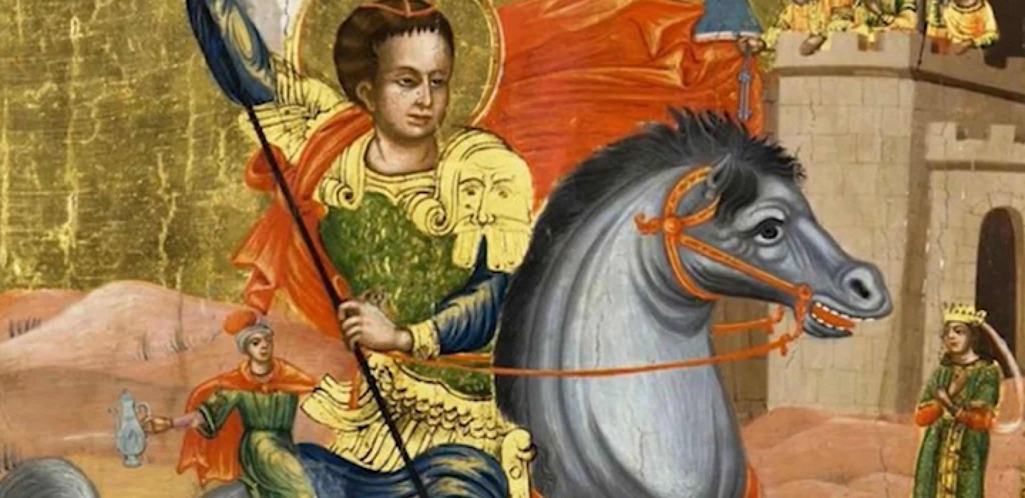 Sveti Georgije se na ikonama predstavlja u vojvodskom odelu, na konju, sa kojeg kopljem probada strašnu aždaju, a nešto dalje od njega stoji jedna žena u svečanom gospodskom odelu (smatra se da je to carica Aleksandra). Aždaja na ikoni predstavlja mnogobožačku silu koja je "proždirala" brojne nevine hrišćane, a žena hrišćansku crkvu. Prema verovanju, Sveti Georgije je pobedio alu i svojom mučeničkom smrću zadao smrtni udarac "neznaboštvu".
