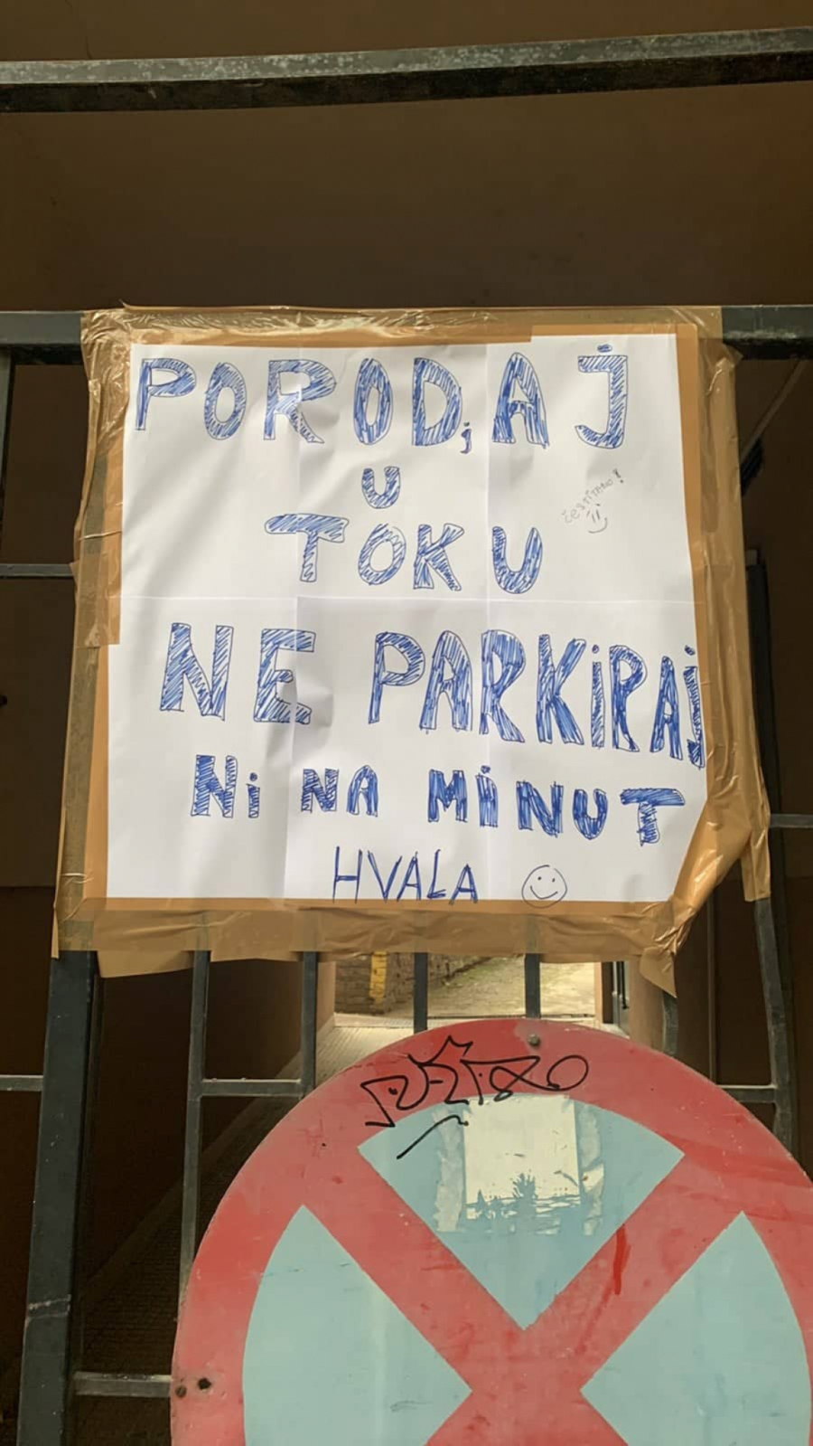 "Porođaj je u toku, ne parkiraj ni na minut! Hvala", piše na ulazu jedne zgrade u Resavskoj ulici.