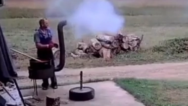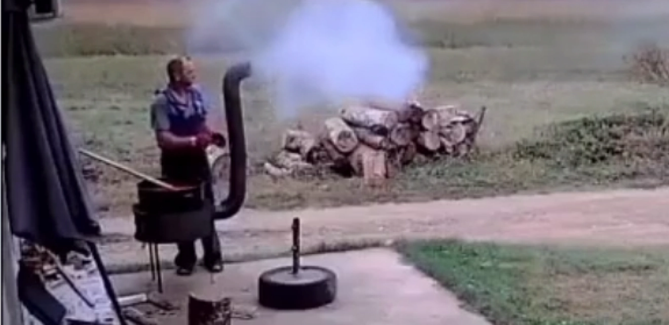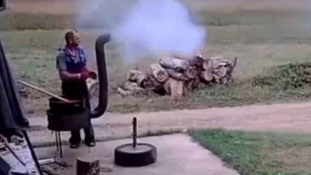 Naime, dok je tražio bolju poziciju za roštilj, odnosno, dimnjak, on je vukao roštilj po betonu, udaljavajući ga od kuće. Iako je to radio pažljivo, na kraju je smesa pala na pod, a sve je bilo propraćeno sočnom psovkom "Jao, sve ti j**m".