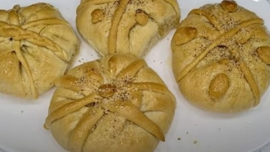Stavite kvasac da nadođe sa pola kašičice šećera i brašna u malo vode. Pomešajte brašno, dodajte so, kvasac, vodu i mesite dok ne dobijete lepo i elastično testo koje se ne lepi za ruke. Ostaviti testo da naraste - oko pola sata, otprilike da naraste na debljinu od dva prsta.