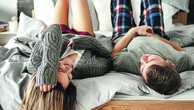 Stariji par leži u krevetu. Muž pospan, kunja, a ženi do romantike. Ona: