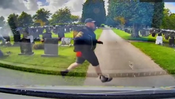 U drugom napetom momentu, vozilo koje se kreće brzinom od 30-ak kilometara na čas za dlaku promašuje invalida u kolicima i osobu koja ga gura dok hodaju pored grobova.