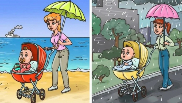 Rešenje slagalice: U redu je hodati po kiši, ali nije dobro da beba bude na suncu bez ikakve zaštite, piše Brightside. Dakle, majka sa leve strane pravi grešku.