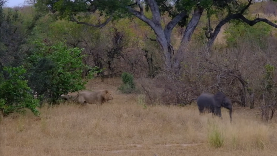 "Lavovi su, osetivši priliku, izašli na put i ubrzo shvatili da je majka slonica ostavila svoje mladunče iza sebe. Mlađi mužjak lava je preuzeo vođstvo u jurnjavi za bespomoćnom slonicom. Nasuprot tome, stariji lav je samo stajao i posmatrao dok je i lavica delovala nezainteresovano“.