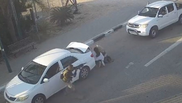 Na snimku, koji je snimljen u subotu, 07.10.2023. u 7.38 časova, vidi se da naizgled ženska osoba traži nešto u gepeku belog automobila koji je parkiran ispred kapije na ul. ulaz u kibuc.