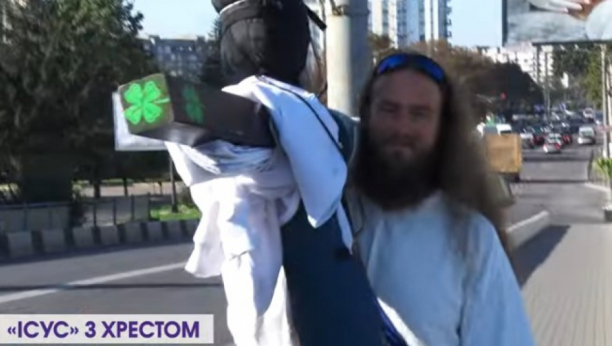 ZAPUTIO SE PEŠKE U KIJEV Momak obučen kao Isus nosi na leđima veliki drveni krst, a ima samo jednu poruku