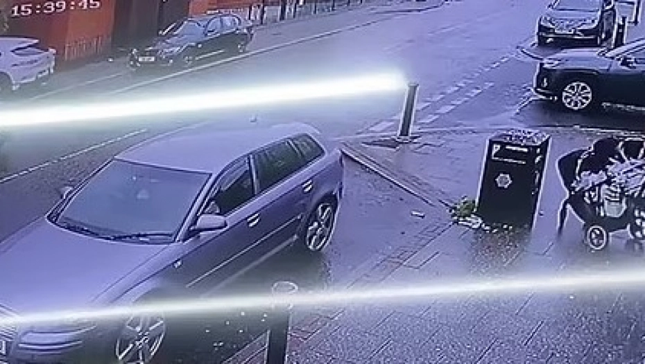 Šokantni snimak CCTV-a prikazuje trenutak kada Jaguar projuri pored majke koja gura kolica i zalijeće se ispred kuće. Službe hitne pomoći su u utorak oko 15.45 časova otrčale u Moston Lejn u severnom Mančesteru nakon što je beli 4k4 prešao put i udario u kuću.