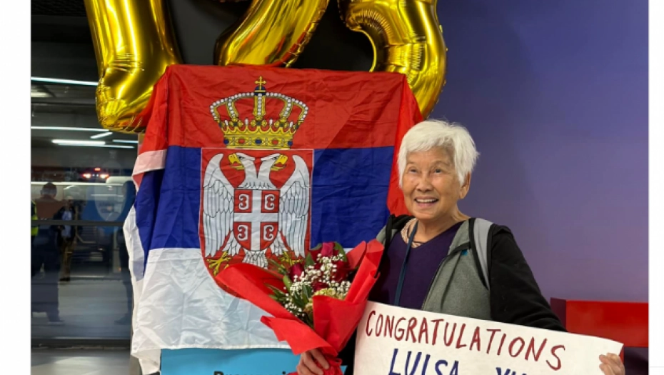 "Čestitamo ti Luiza, obišla si sve zemlje sveta, tvoja poslednja zemlja je Srbija", pisalo je na transparentu koji je sačekao ovu nasmejanu i živahnu ženu na aerodromu.