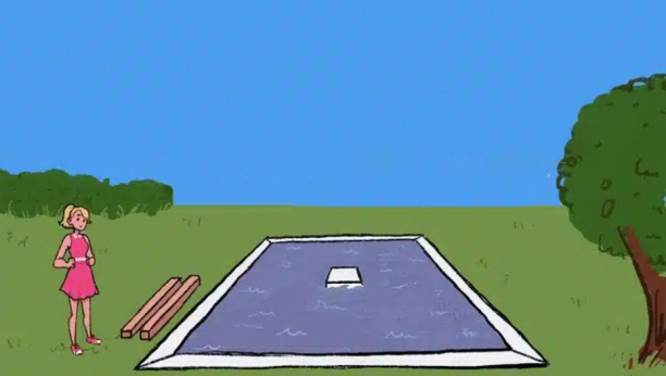 Naša današnja slagalica je jedna od te vrste: Sanja želi da stigne do ostrva usred bazena. Svaka ivica bazena je udaljena 10 metara od ostrva. Sanja ima dve drvene grede dužine 9 metara. Kako će Sanja stići do ostrva?