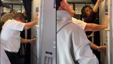 Viralni snimak pokazuje kako Brent gura vrata toaleta dok ih pilot drma i pokušava da ih otvori.