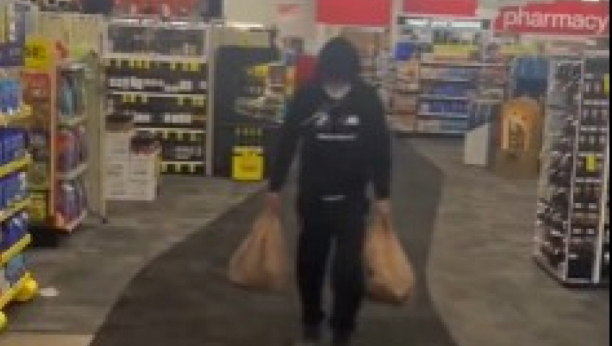 Na dramatičnom snimku vidimo momka u crnoj dukserici i maski na licu kako izlazi iz prodavnice noseći kese.