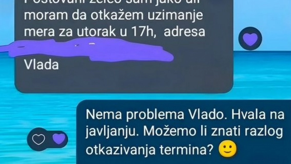 "Nema problema, Vlado. Hvala na obaveštenju. Da li bismo mogli da znamo razlog otkazivanja termina? :)“