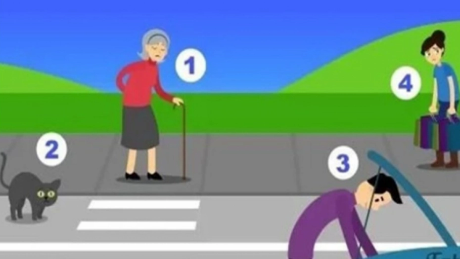Pogledajte ilustraciju i iskreno odgovorite kome biste prvo pomogli? Da li je to starica koja pokušava da pređe ulicu, žena s teškim torbama, muškarac kojem se automobil pokvario ili mačka koja deluje izgubljeno i nalazi se nasred kolovoza?